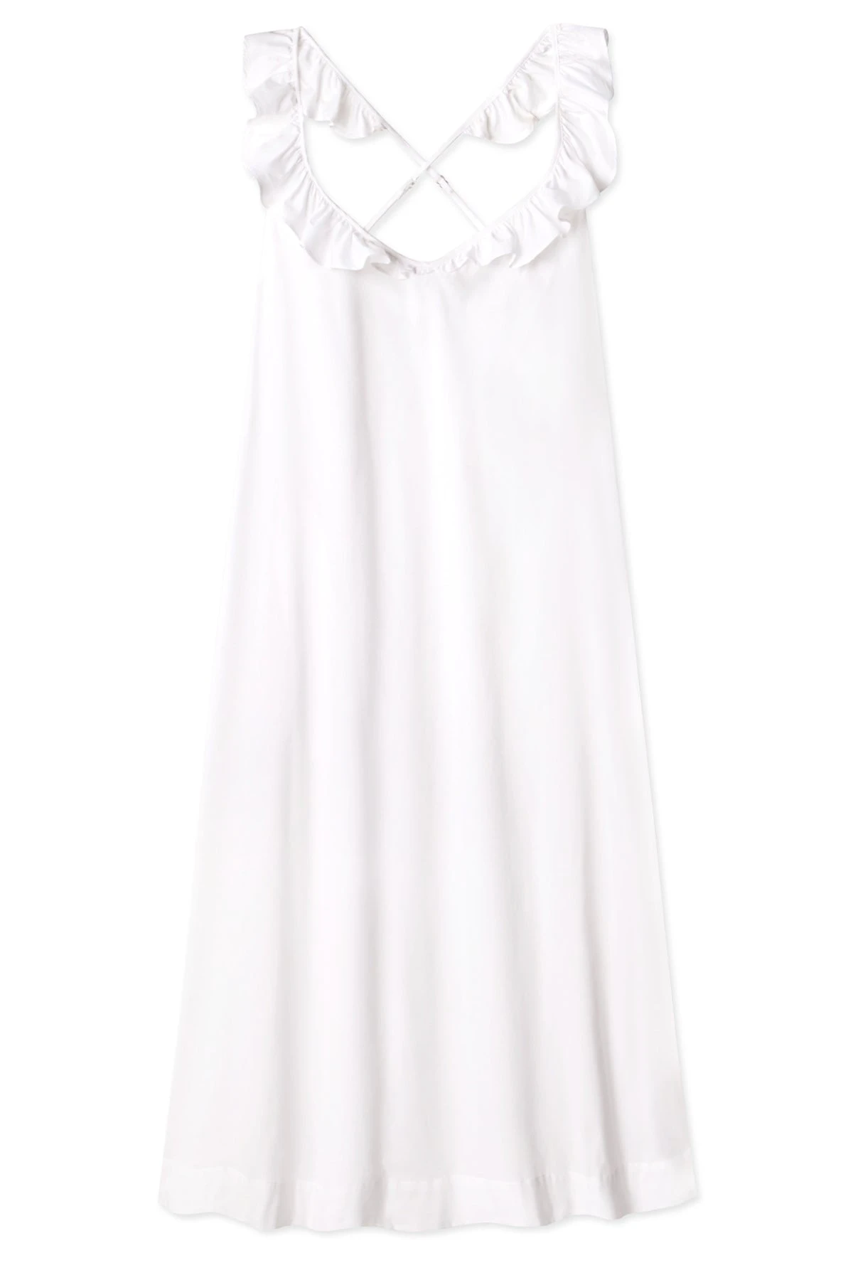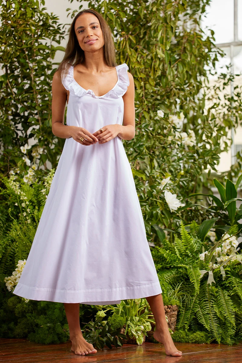 The Amelia Nightgown in White features a ruffled neckline with practical, cross-back straps and on-seam pockets with a true midi length. An easy-care, stretch poplin blend means fewer wrinkles. Made of 67% cotton, 30% polyester, 3% elastane.