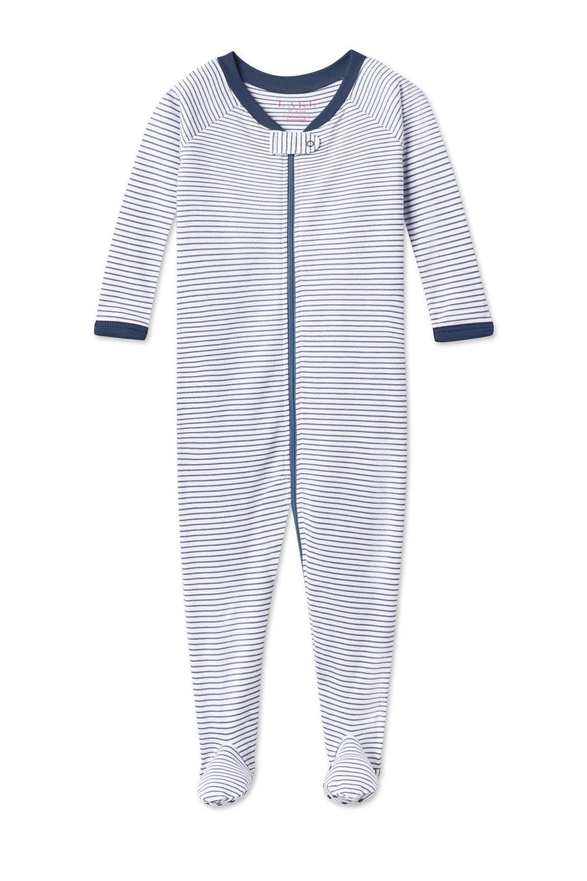 Classic Navy features a dual zipper for easy diaper changes. Designed for sleep or play in silky soft, naturally hypoallergenic 100% Pima cotton, this fuss-free, footed style includes sole grips on sizes 3-6m & up.