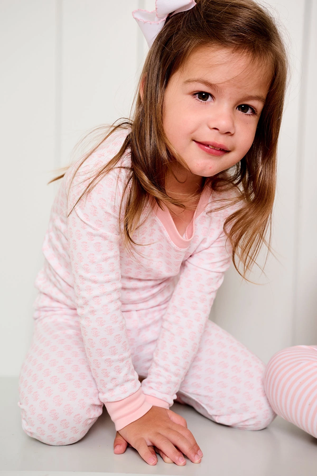 The Kids Long-Long Set in English Rose Blockprint, a hand-painted mini block print, features a long-sleeve top and pants with an elastic waistband. Made from 100% Pima cotton. This garment is not flame resistant. For the child’s safety, this garment should fit snugly.