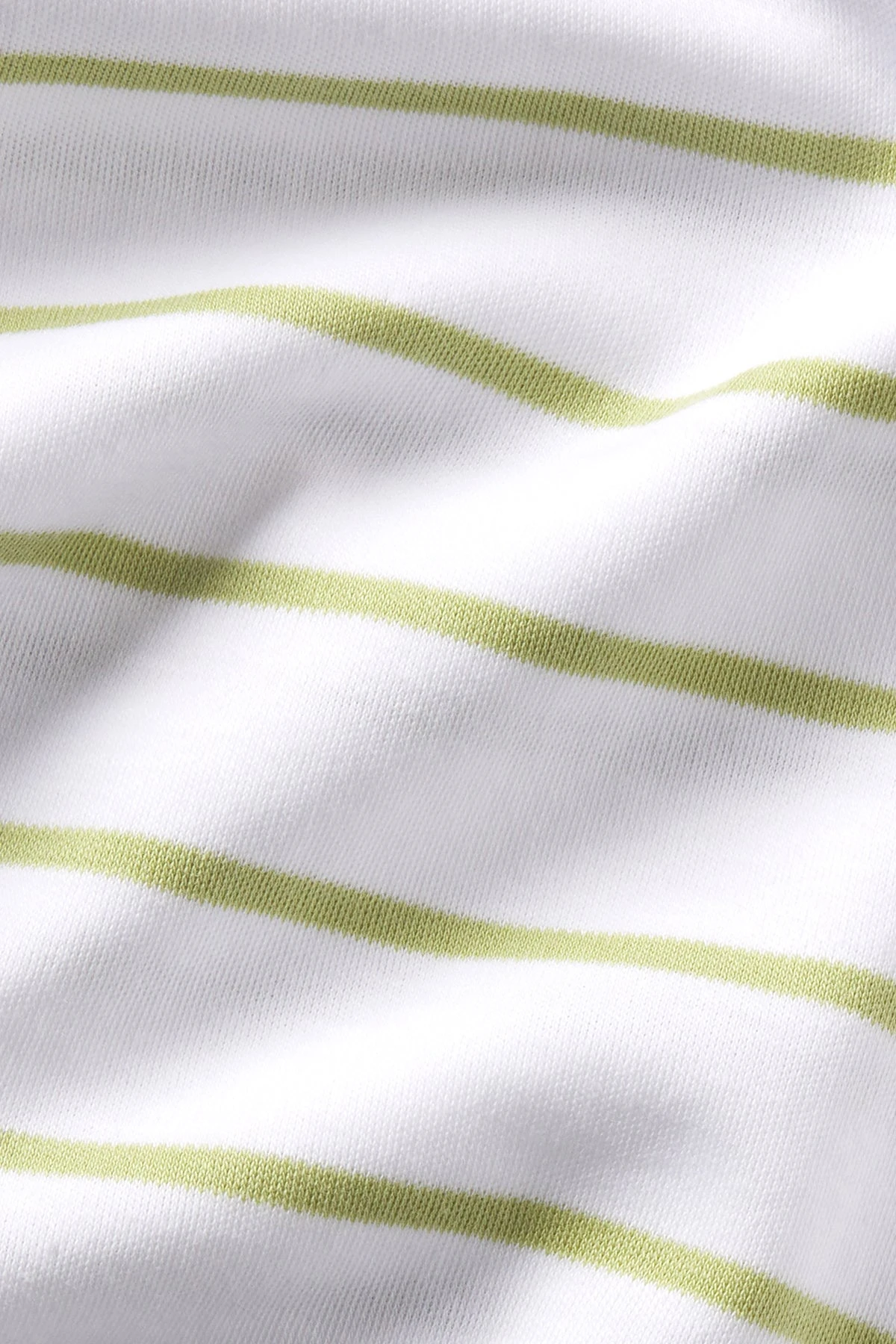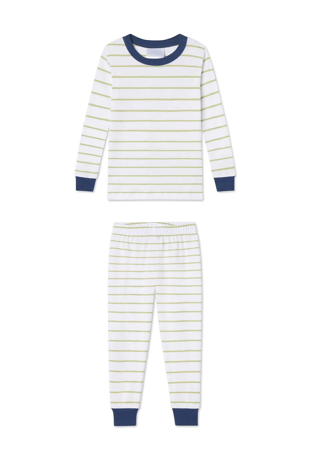 The Kids Long-Long Set in Olive Stripe, a thin, green stripe with contrasting blue binding, features a long-sleeve top and pants with an elastic waistband. Made from 100% Pima cotton. This garment is not flame resistant. For the child’s safety, this garment should fit snugly.