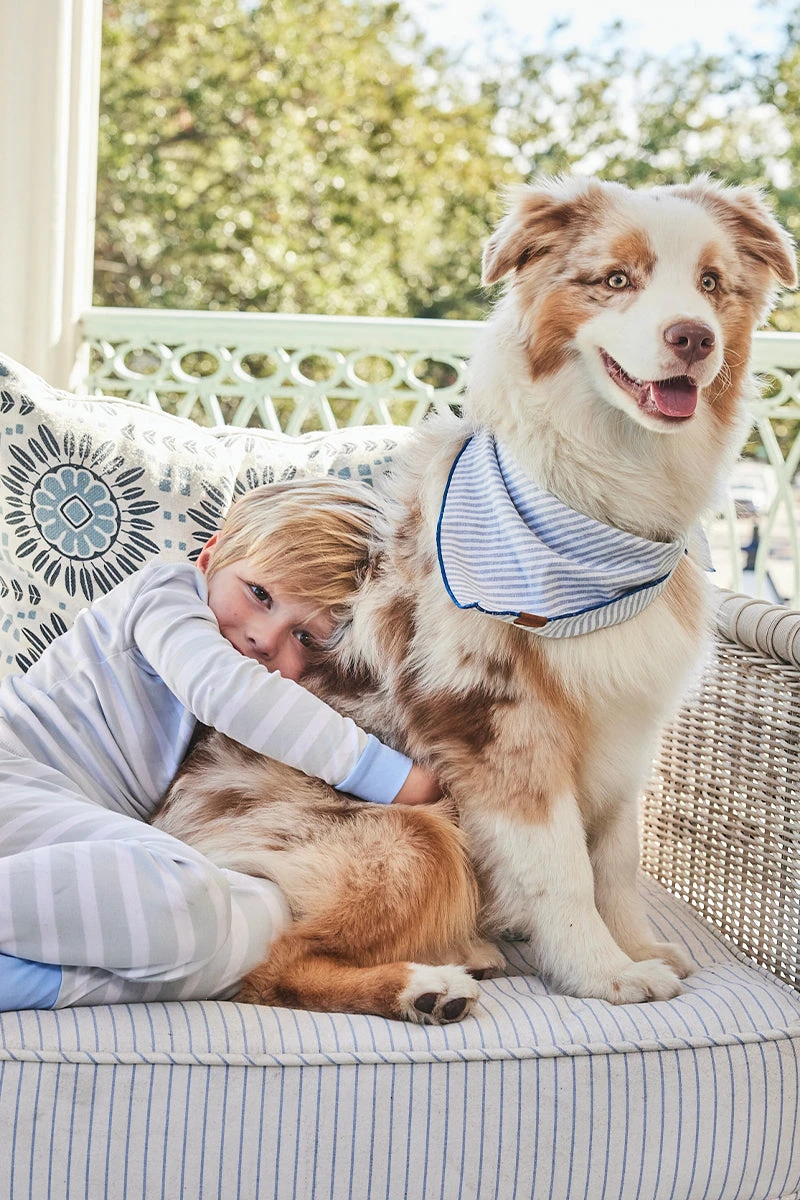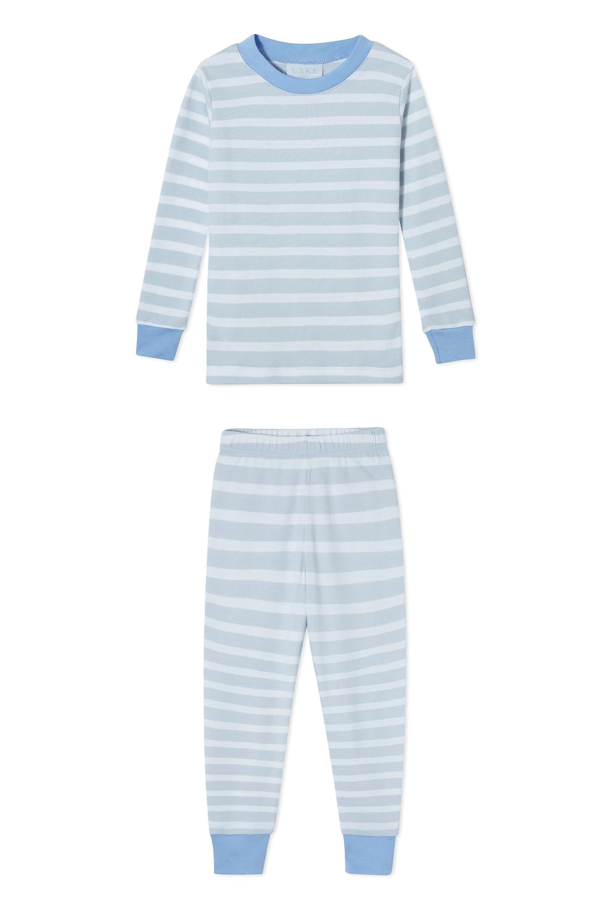 The Kids Long-Long Set in Seaside, a muted blue and white stripe with contrasting blue trim, features a long-sleeve top and pants with an elastic waistband. Made from 100% Pima cotton. This garment is not flame resistant. For the child’s safety, this garment should fit snugly.