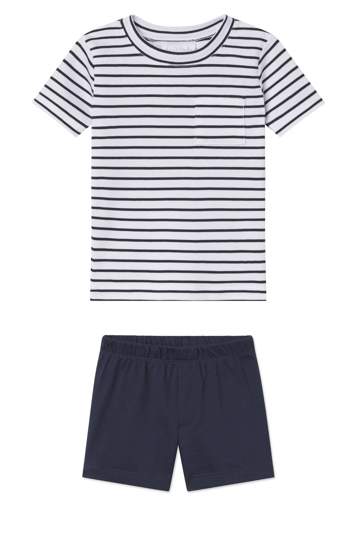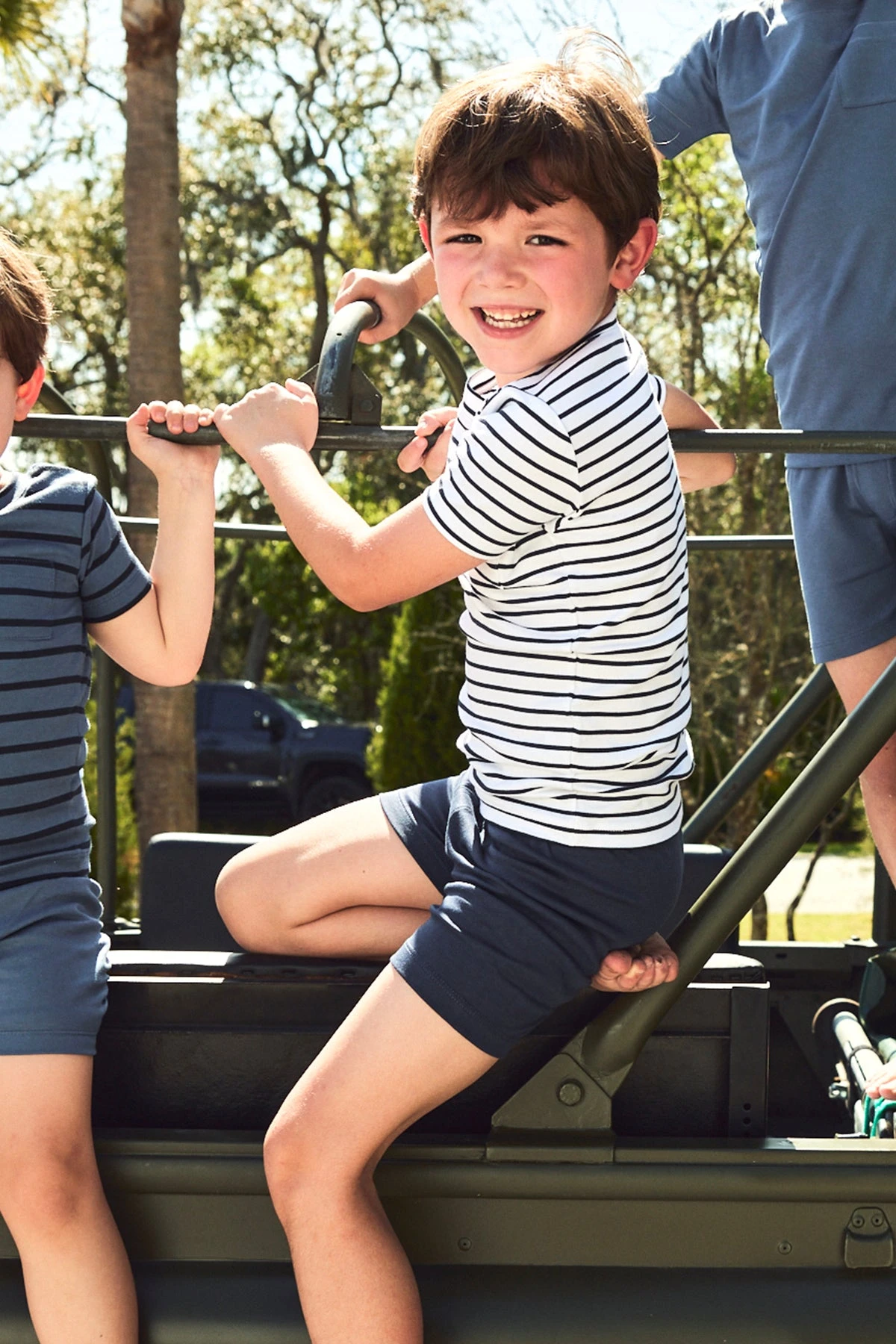 The Kids Pima Pocket Shorts Set in Eclipse includes short-sleeve top in a navy and white stripe with a faux pocket and shorts with an elastic waistband. Designed with boys in mind, this style features boxer brief-inspired navy shorts with a faux fly detail. Made from 100% Pima cotton. This garment is not flame resistant. For the child’s safety, this garment should fit snugly.