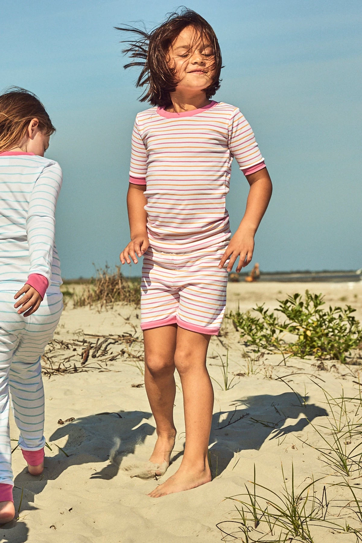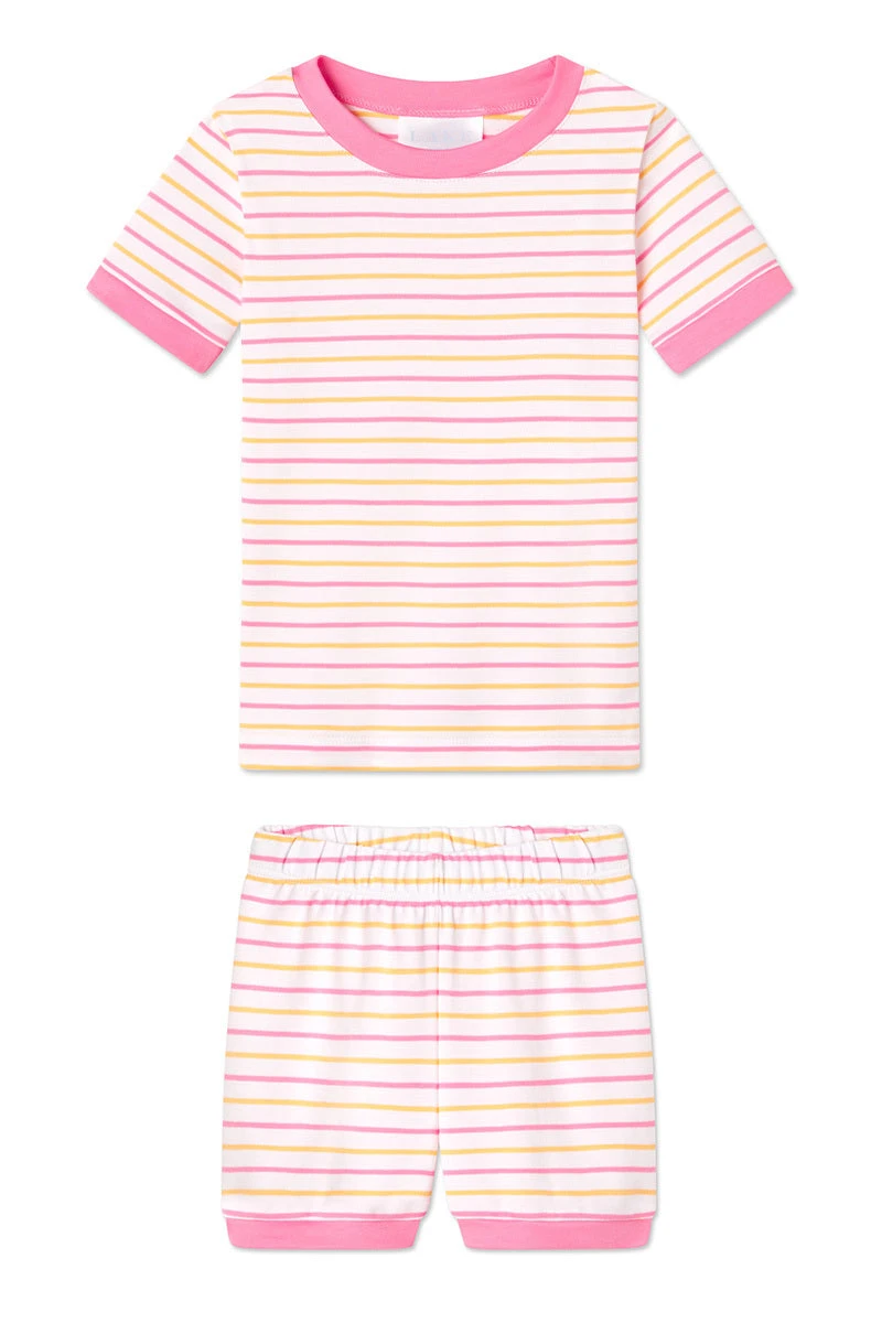 The Kids Shorts Set in Sherbet Stripe, a multi-colored stripe in orange and pink, features a short-sleeve top and shorts with an elastic waistband. Made from 100% Pima cotton. This garment is not flame resistant. For the child’s safety, this garment should fit snugly.