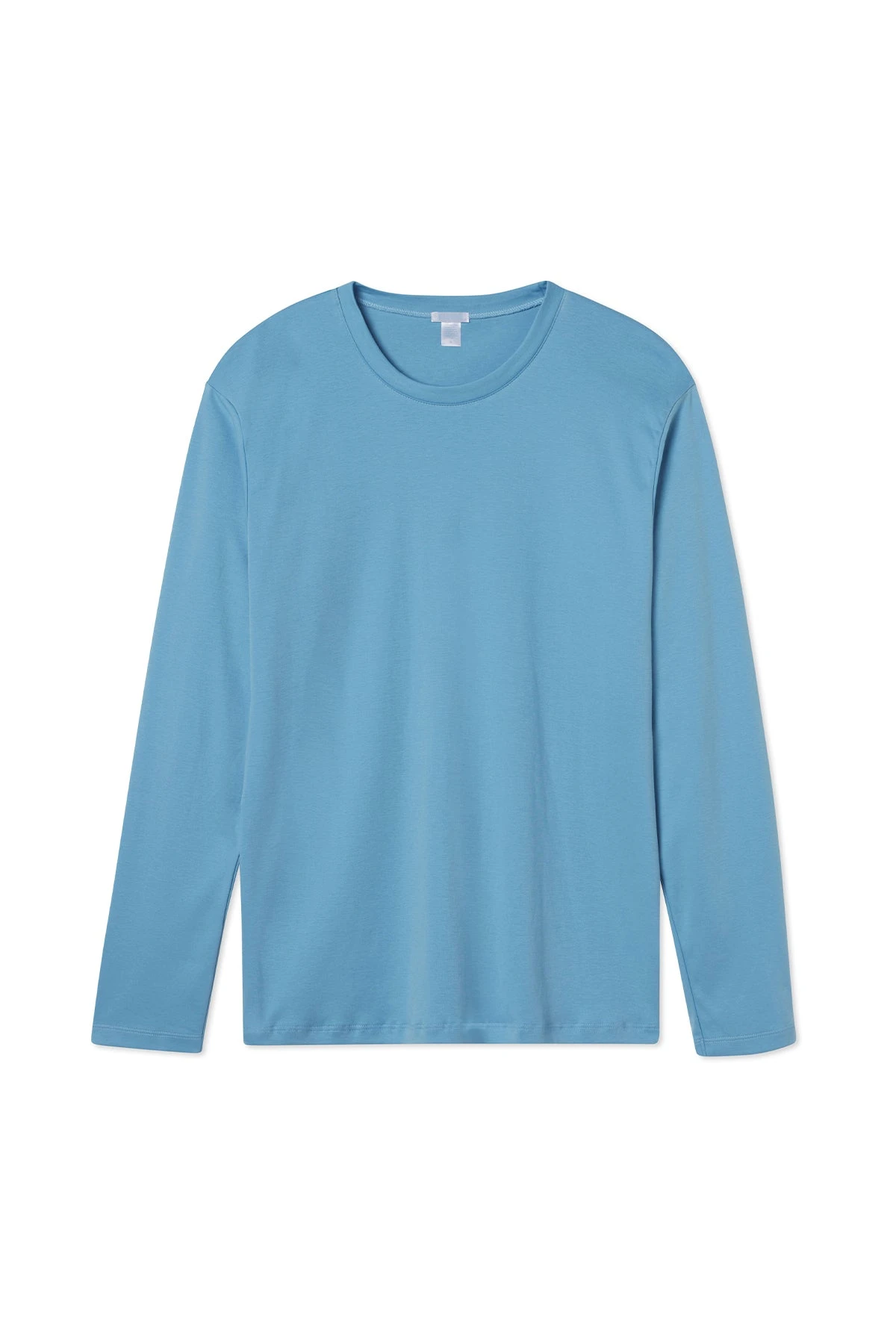 The Mens Long Sleeve Pima Tee in Pacific, a blue inspired by surf and sky, is ideal for lounging at home or cruising in comfort. This style is a long-sleeve crewneck and is made from luxuriously soft, 100% Pima cotton.