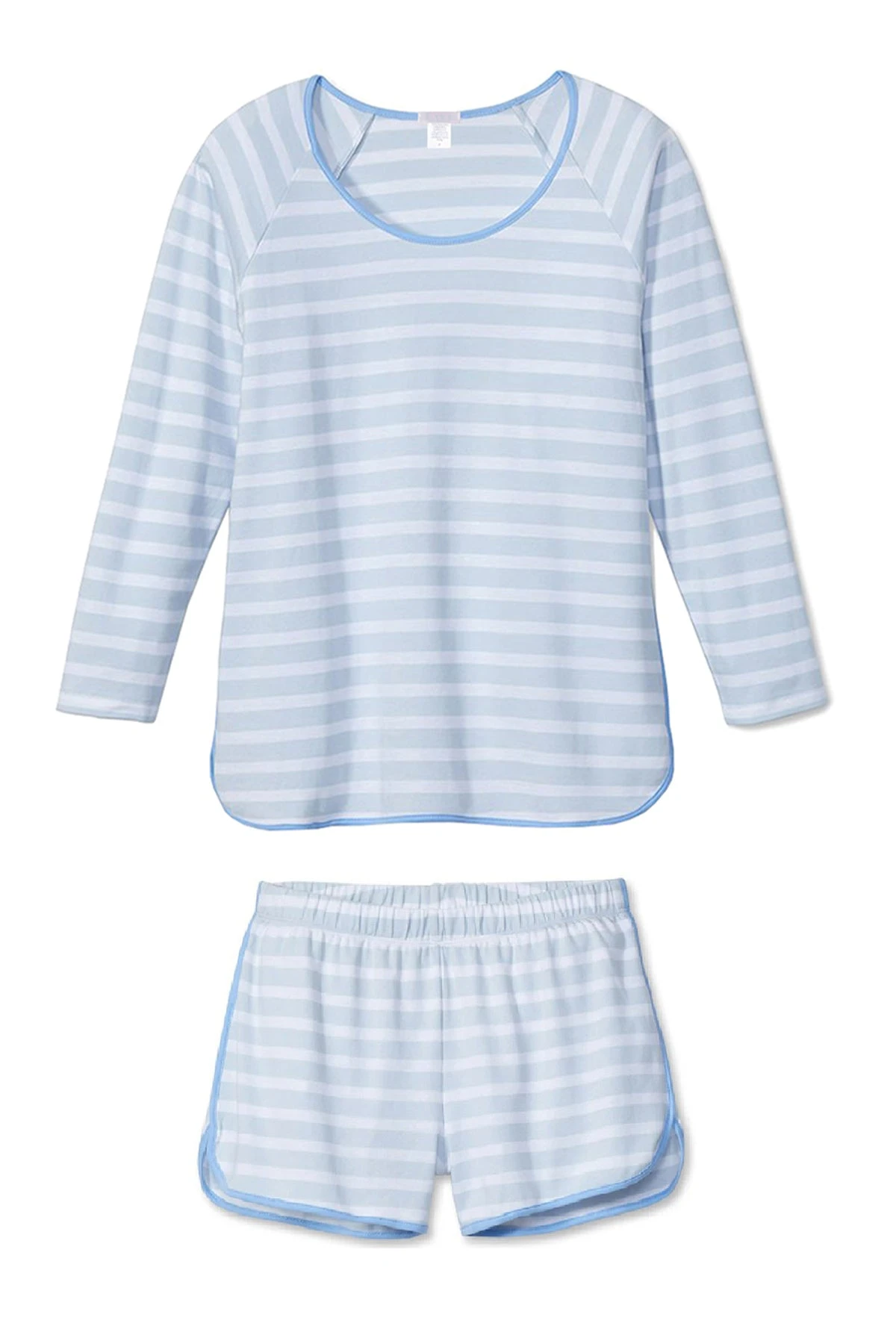 The Pima Long-Short Set in Seaside, a muted blue and white stripe with contrasting blue trim, features a three-quarter length sleeve scoop neck top and shorts with an elastic waistband and 3″ inseam. Made from 100% Pima Cotton.