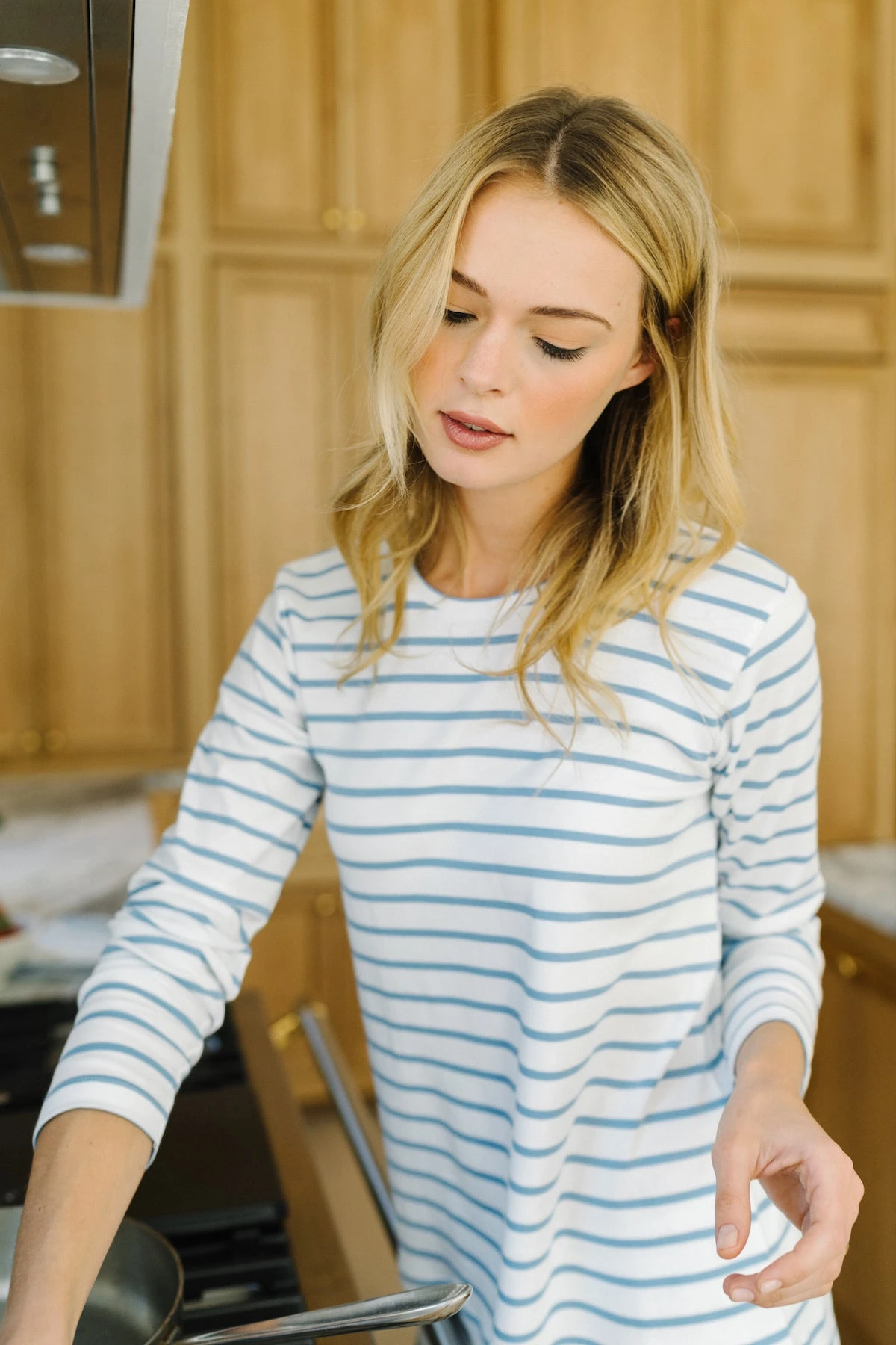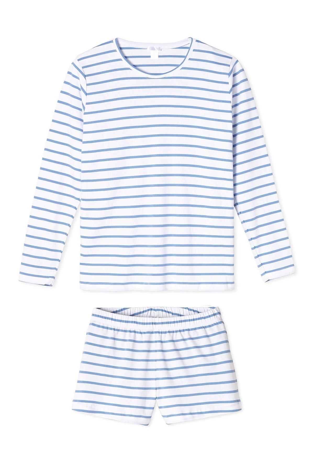 The Pima Long-Short Weekend Set in Bistro, a soft, mid-toned blue stripe set on white, features a long-sleeve crewneck top and shorts with an elastic waistband and 3″ inseam. Made from 100% Pima Cotton.