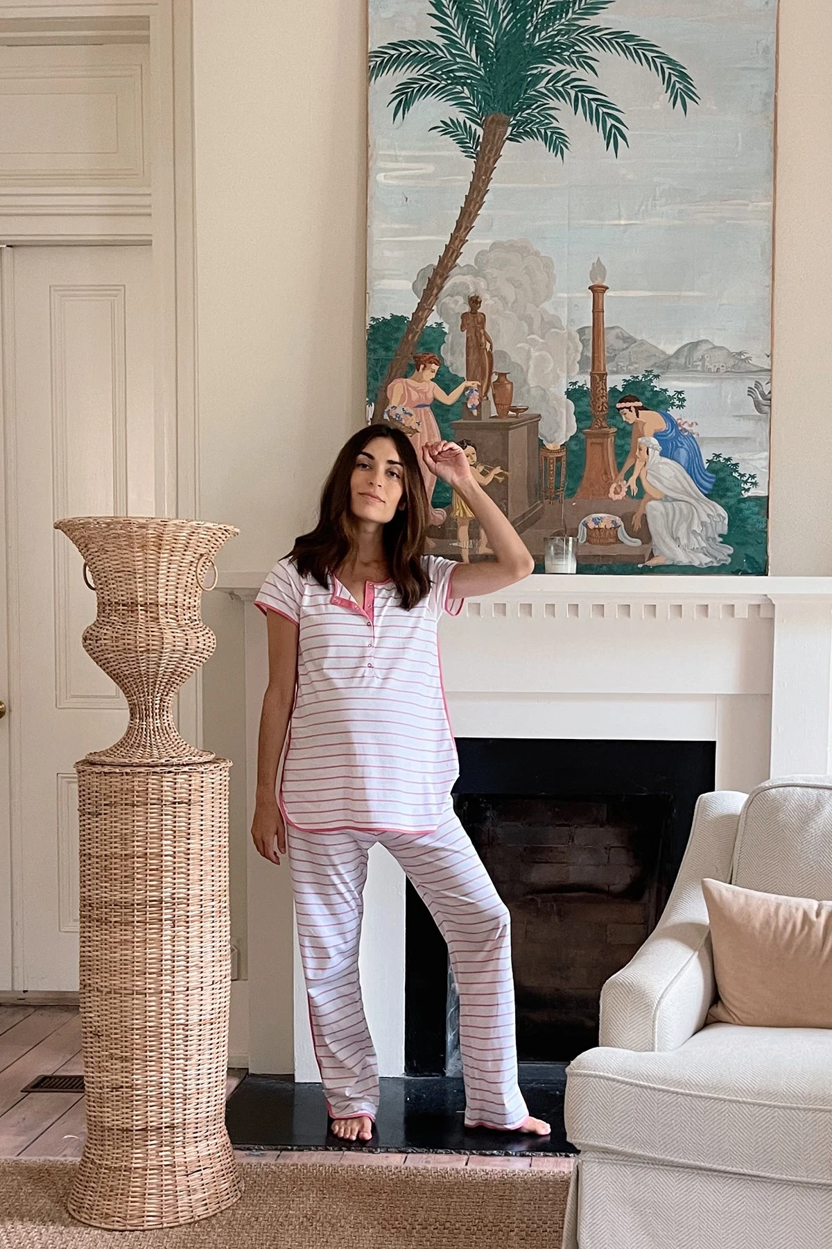 The Maternity Short-Long Set in Rose, a soft yet saturated pink, features a short-sleeve scoop neck top with nursing-friendly snaps and room for a bump. The pants have an elastic waistband. It’s ideal for pregnancy and post-delivery. Made from 100% Pima cotton.