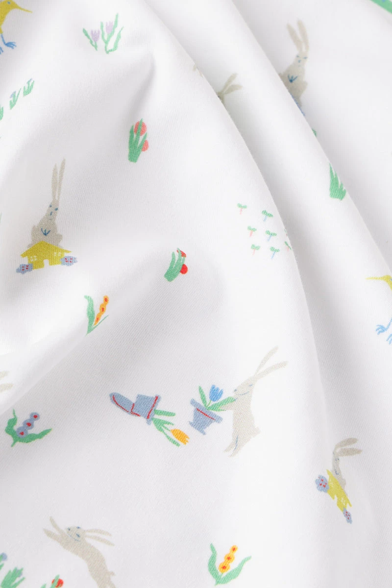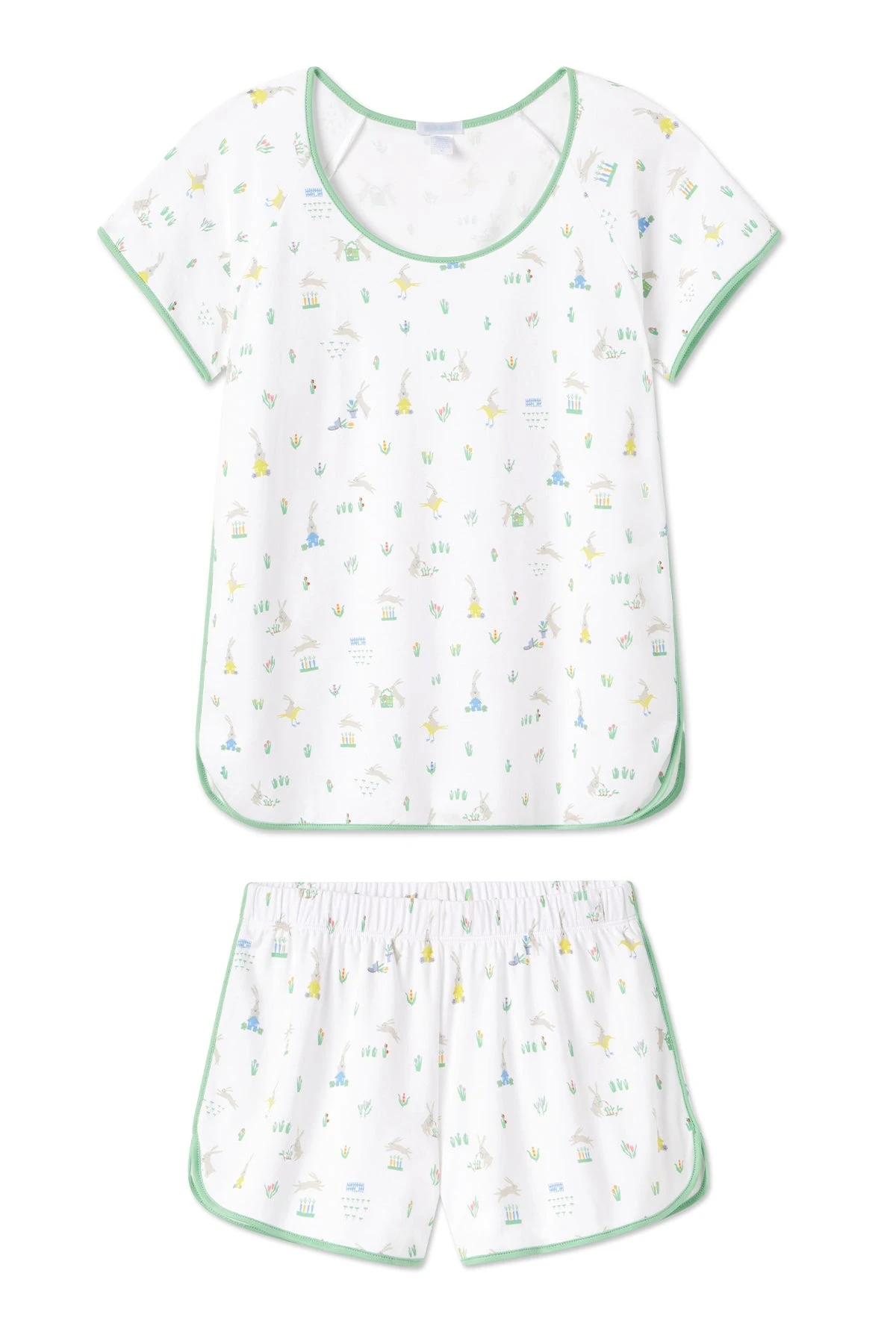 The Pima Shorts Set in Bunnies, a basket-ready print of playful rabbits in pastel tones with a soft green trim, features a short-sleeve scoop neck top and shorts with an elastic waistband. Made from 100% Pima cotton.