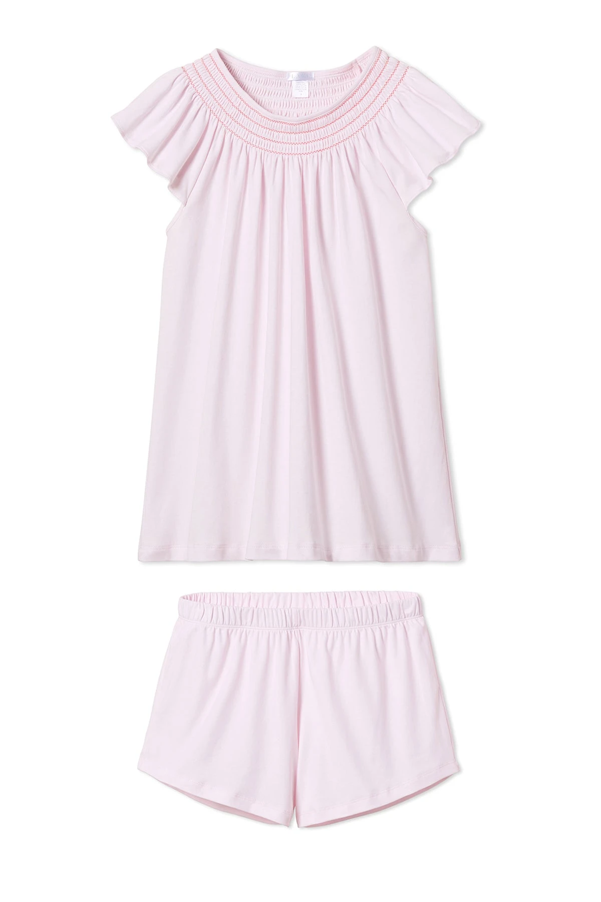 The Smocked Flutter Shorts Set in Azalea, a soft pink, features a top with pretty flutter sleeves and coordinating smocking at the neck and is paired with our perfect stay-put shorts. This set will take you through the warmer months with ease. Made from 100% Pima cotton.