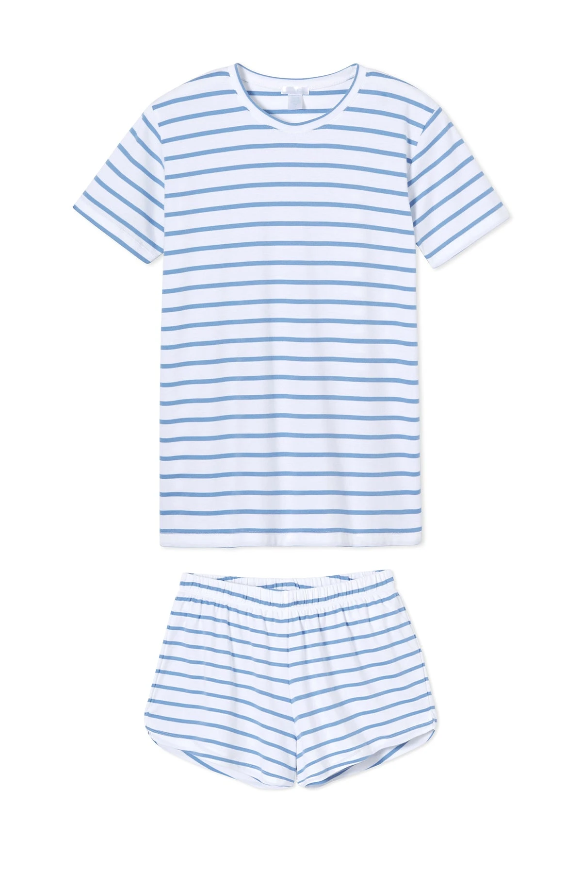 The Weekend Shorts Set in Bistro, a classic blue stripe, features a fitted crewneck top. The shorts have an elastic waistband and straight-edge hem. Made from 100% Pima cotton.
