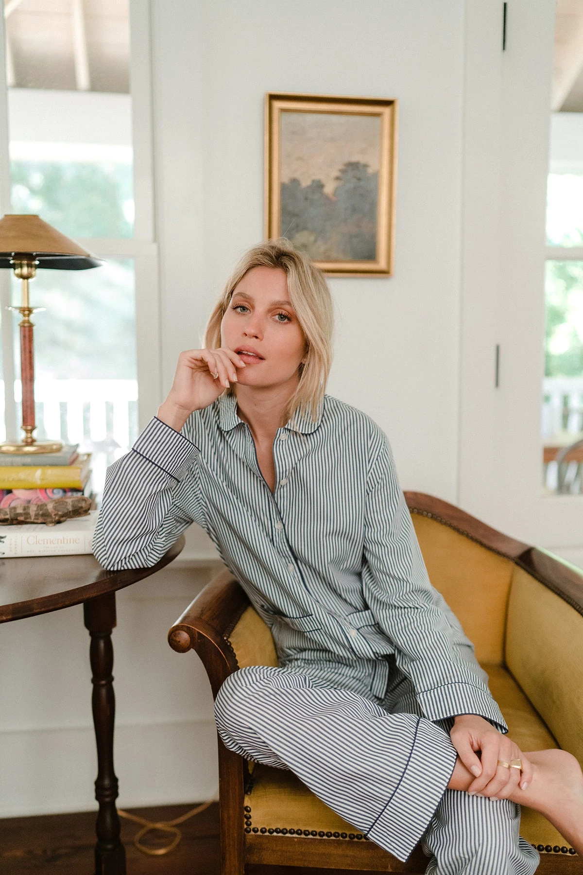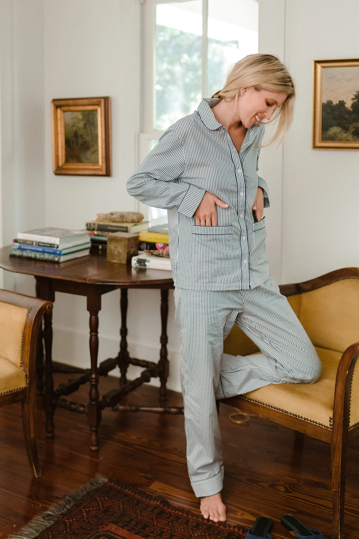 The Piped Pants Set in Navy Stripe, an iconic navy blue and white stripe with navy piping, features a collared long-sleeve button-up top and pants with pockets and an elastic waist. Made of 100% cotton poplin.